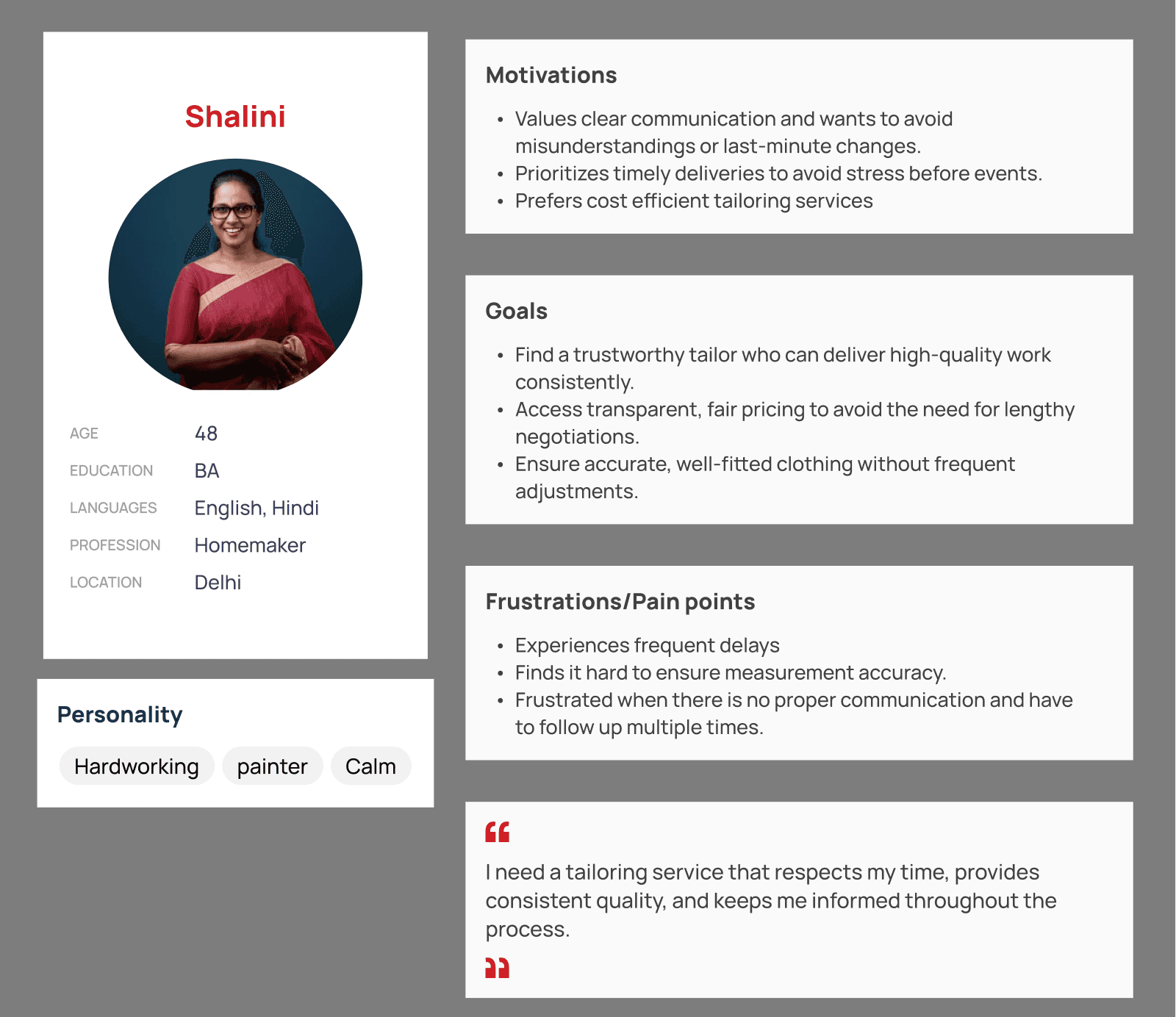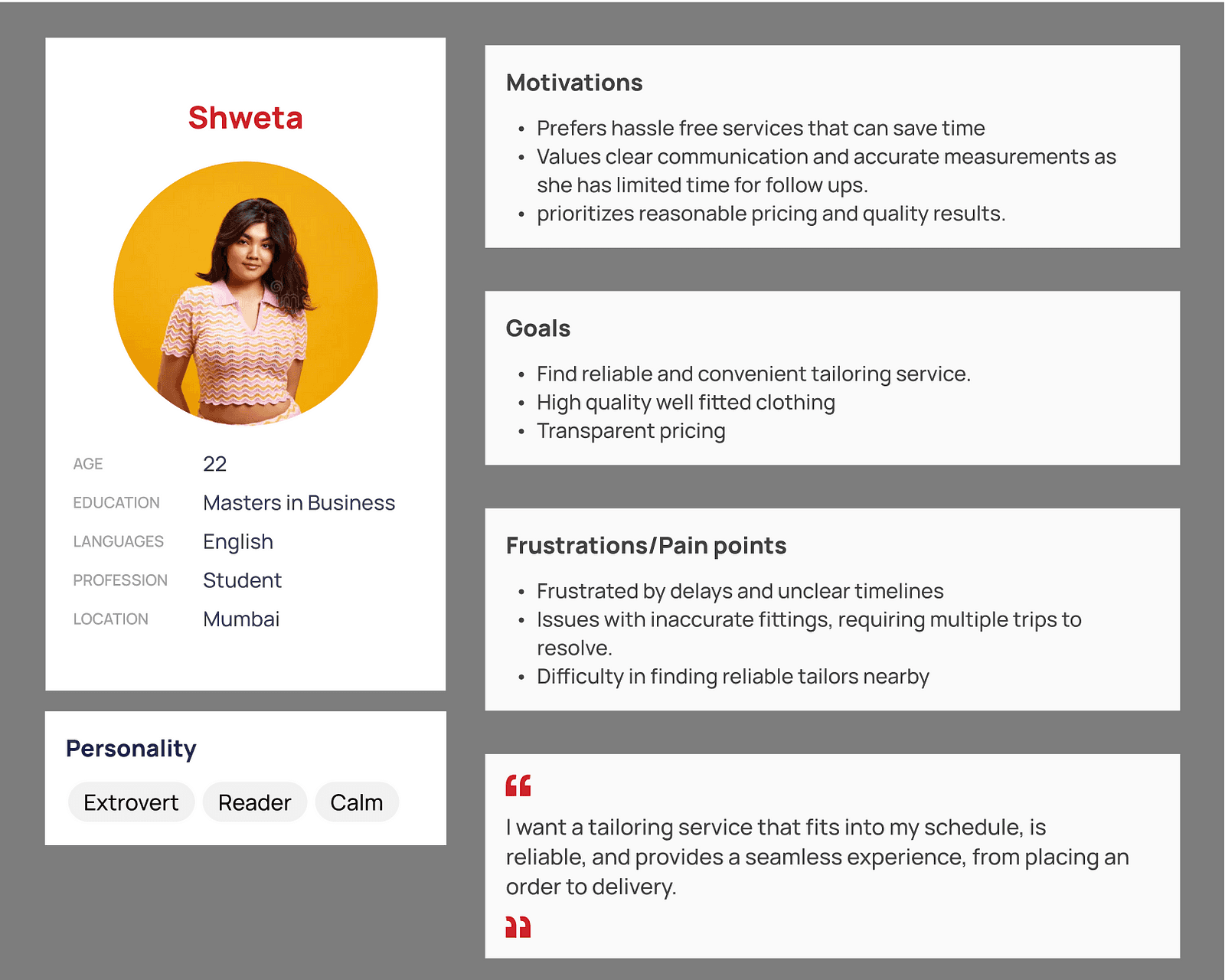 - Users are motivated by a desire for convenient, reliable, and high-quality tailoring services.