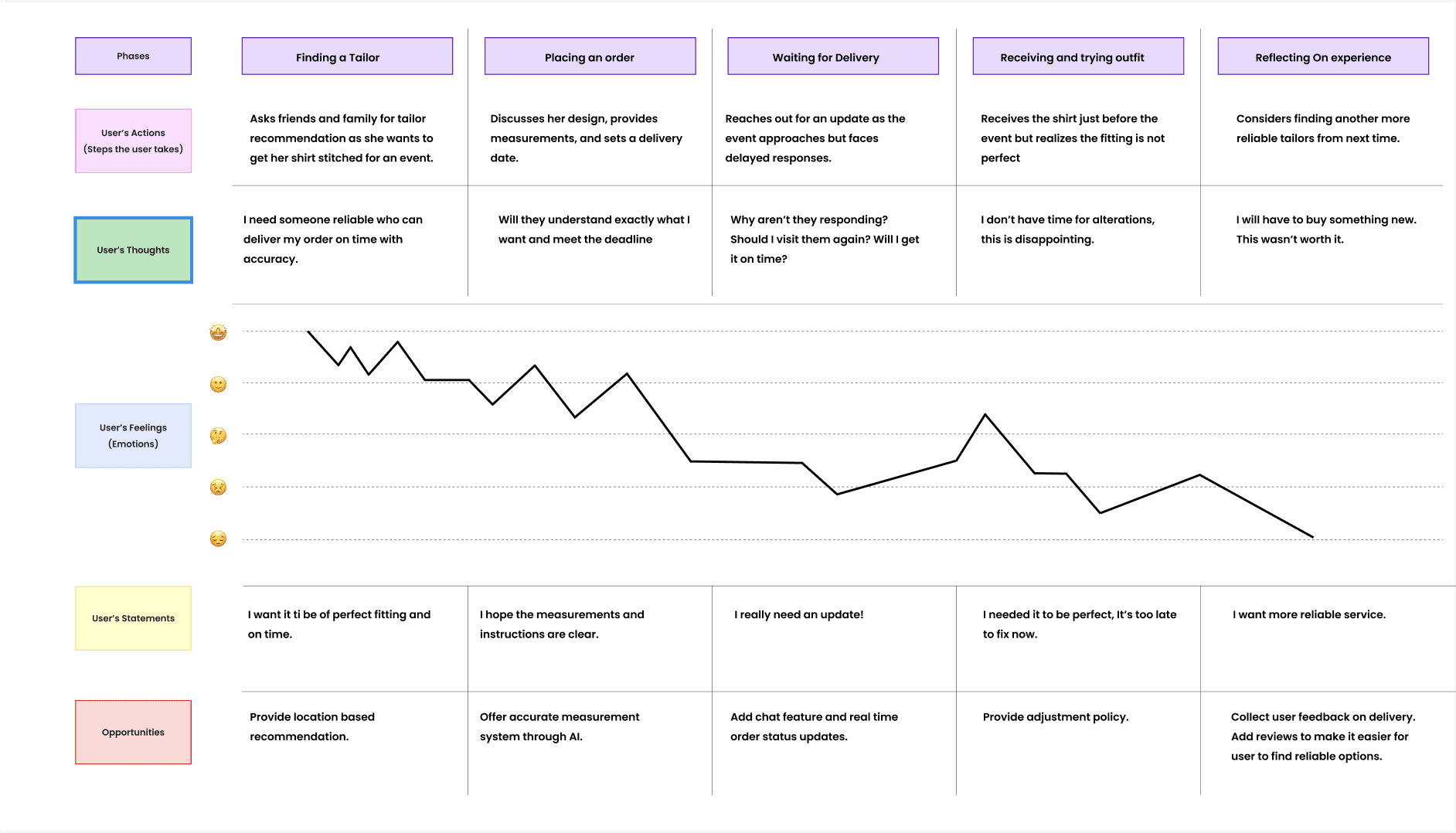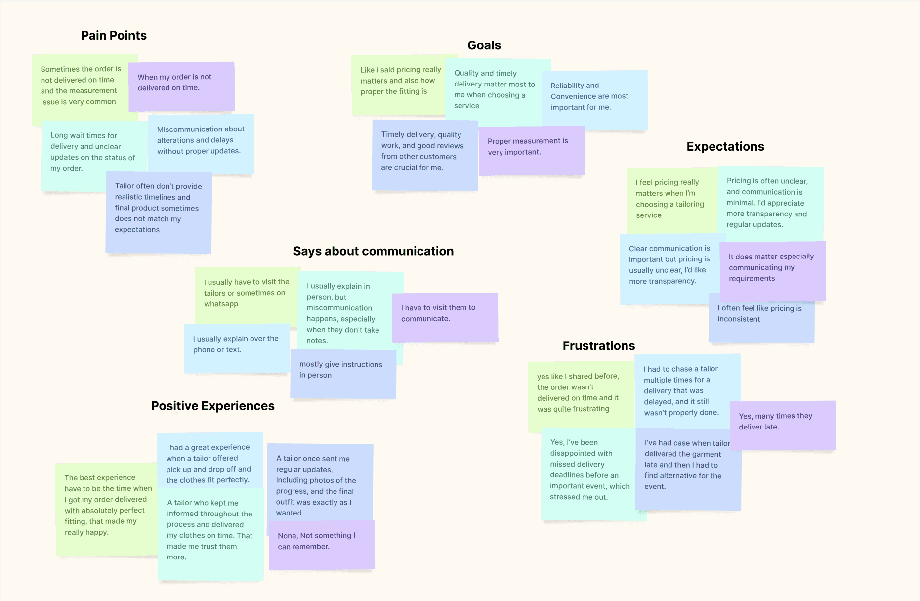 - Users want accurate timelines, clear communication, and a seamless tailoring process from booking to delivery.